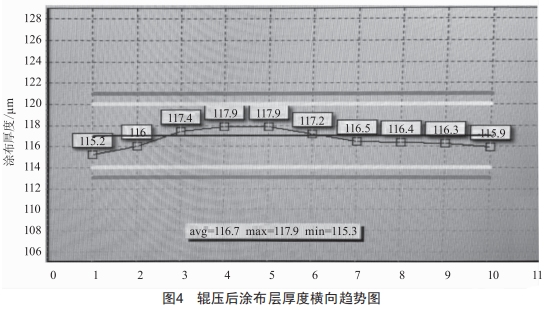 針對涂布層寬度方向取10個點,激光在線測厚儀檢測得出的厚度橫向趨勢圖如圖4所示??梢钥吹?涂布厚度最大為117.9μm,最小為115.2μm,厚度平均值為116.7μm,涂布厚度精度范圍可達到士1.4μm,接近國際先進水平。其中最小厚度基本處于兩端,最大厚度偏向于中間位置。