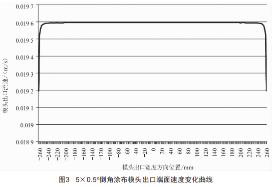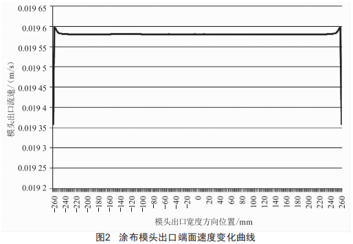如圖2所示,從得到的出口處速度曲線來看,出口端面的速度整體來說比較均勻,在出口面的兩端出現(xiàn)突起,顯示最大流速為0.019579m/S。漿料出口處的流速和涂布厚度成正比,由此可知,速度快會導(dǎo)致漿料在基材上的兩端比起中間的涂布層較厚。
