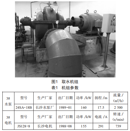 東莞市某水廠是20世紀80年代末90年代初分兩期建成投產(chǎn)的常規(guī)制水水廠,一期設(shè)計能力12萬m3/d,二期設(shè)計能力6萬m3/d,兩期共計供水能力18萬m3/d。取水泵房共有四臺取水機組,根據(jù)現(xiàn)時供水量,正常生產(chǎn)采用兩用兩備開機模式。其取水泵、電動機(圖1)是20世紀80年代國產(chǎn)設(shè)備,電動機導(dǎo)磁材料使用熱軋硅鋼片,能耗高、效率低、容易受潮。水泵效率與當(dāng)前市場上的產(chǎn)品相比也比較低。我廠考慮到原電動機能耗高、效率低、環(huán)保性差,而配套的水泵揚程較高,同樣存在耗能情況,而且3#機組是取水泵房四臺機組效率最低的一臺(參數(shù)如表1所示),為進一步落實公司節(jié)能降耗的工作安排,降低我廠的生產(chǎn)成本,預(yù)備先對取水泵房3#機組進行改造。