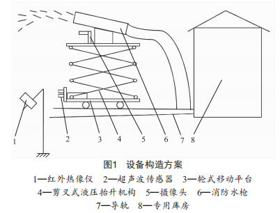 結(jié)合倉庫的建設(shè)背景,本文所提出的方案是在倉庫重地的外圍搭建安防的智能設(shè)備,在未檢測到火情時(shí),該消防設(shè)備被安置在指定的車庫里,通過車庫的保障可以避免該消防設(shè)備遭到雨淋日曬。車庫由里到外,本文設(shè)計(jì)了用于消防設(shè)備移動的專用導(dǎo)軌,如圖1所示,該消防設(shè)備的移動采用輪式移動平臺,輪式移動平臺的上方設(shè)有剪叉式液壓抬升機(jī)構(gòu),輪式移動平臺的前方設(shè)有用于檢測障礙物的超聲波傳感器,剪叉式液壓抬升機(jī)構(gòu)的上方設(shè)有用于監(jiān)控現(xiàn)場的攝像頭以及消防水槍。據(jù)研究,紅外熱像技術(shù)可用于監(jiān)測火情,紅外熱像儀具有快速測量物體表面溫度的特點(diǎn),并且效果好,與其他測溫方法相比,其優(yōu)勢有:第一,可遠(yuǎn)距離測量:第二,即使被檢測的目標(biāo)表面溫度分布不均勻,該方法也依然適用:第三,該方法還適合應(yīng)用在有限的區(qū)域范圍內(nèi)進(jìn)行監(jiān)測,能快速獲取到過熱區(qū)域的位置以及過熱點(diǎn)的位置。作為一種光電轉(zhuǎn)換器件,紅外熱像儀內(nèi)部的集成電路能將接收到的紅外熱輻射能量轉(zhuǎn)化為電信號,然后利用AD轉(zhuǎn)換的運(yùn)算,將該電信號轉(zhuǎn)化成數(shù)字信號,相應(yīng)的數(shù)字信號能以圖像方式體現(xiàn),借助顯示器即可顯示。李云紅等學(xué)者的研究表明,通過對獲取的紅外圖像進(jìn)行運(yùn)算可以從該圖像讀出被測物體表面上的每一個點(diǎn)的輻射溫度值。綜合前段所述,本文提出了相應(yīng)的方法,就是在倉庫重地外圍居高設(shè)置多個紅外熱像儀,實(shí)時(shí)監(jiān)測倉庫是否發(fā)生火情。