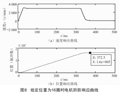 (1)給定位置信號為16圈(即16×2500×4=160000個(gè)脈沖)時(shí)電機(jī)的階躍響應(yīng)曲線如圖8所示。