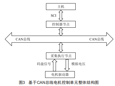 基于CAN總線的伺服電機(jī)控制系統(tǒng)實(shí)現(xiàn)對一臺電機(jī)的位置伺服控制,包括兩個(gè)節(jié)點(diǎn):主控制器節(jié)點(diǎn)、信號采集及執(zhí)行機(jī)構(gòu)節(jié)點(diǎn)。其整體結(jié)構(gòu)框圖如圖3所示。