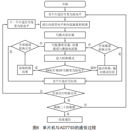 AD7793的通信過(guò)程與AD7193不同,原因主要在于AD7793無(wú)法同時(shí)使能多個(gè)模擬轉(zhuǎn)換通道,開啟一次轉(zhuǎn)換只能測(cè)試一個(gè)通道。片選引腳拉低之后,便可設(shè)置模式寄存器和配置寄存器,設(shè)置激勵(lì)電流源大小,開啟單次轉(zhuǎn)換模式,ADC便進(jìn)入相應(yīng)通道的轉(zhuǎn)換過(guò)程中。等待轉(zhuǎn)換完成并讀取轉(zhuǎn)換結(jié)果,完成后再次對(duì)配置寄存器進(jìn)行寫操作,改變使能通道,而保持激勵(lì)電流源等設(shè)置不變,進(jìn)入下一通道的轉(zhuǎn)換,直至此芯片的每一個(gè)通道都執(zhí)行完成轉(zhuǎn)換操作,便進(jìn)入下一AD7793芯片的轉(zhuǎn)換過(guò)程。循環(huán)采集三十組電壓數(shù)據(jù),取平均值并用于計(jì)算待測(cè)電阻阻值。單片機(jī)與AD7793的具體通信過(guò)程如圖6所示。