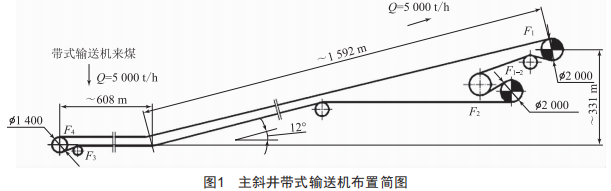 方案二、方案三都能有效降低輸送帶帶強,但井筒中部需要設相關碉室,增加了井巷工程的工程量和施工難度,中部的設備運送及檢修也不方便。當采用變頻驅(qū)動時,由于大功率高壓防爆變頻器目前尚無正式產(chǎn)品,所以變頻器只能放在井口房內(nèi),距離中部驅(qū)動裝置較遠,需用長電纜下送。方案一采用一臺帶式輸送機,驅(qū)動裝置設在主斜井井口處,檢修維護方便,井筒中部不設驅(qū)動裝置碉室,減少了井筒工程量,雖帶強較高,但目前國內(nèi)外產(chǎn)品均能滿足要求。經(jīng)綜合比較,選擇方案一為設計方案。主斜井帶式輸送機布置簡圖如圖1所示。