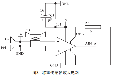 為實現(xiàn)商品稱重,設(shè)計采用電阻應(yīng)變式壓力傳感器。由于其輸出電壓很小,為了使這個電壓的值與A/D轉(zhuǎn)換器的轉(zhuǎn)換電壓范圍匹配,要使用放大電路對信號進行放大。稱重傳感器放大電路如圖3所示。