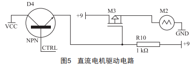 驅(qū)動直流電機控制傳送帶運行不需要很高的精度,且直流電機的電流較大,所以在傳送帶電機的驅(qū)動中采用MoSFET管。直流電機驅(qū)動電路如圖5所示。