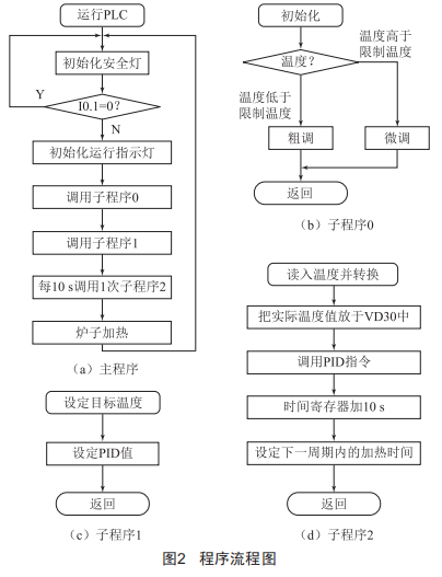 主程序上電后,根據(jù)溫度傳感器中的值,對(duì)安全指示燈進(jìn)行初始化,之后,分別按順序調(diào)用子程序0、1、2,其中子程序0用于和給定值比較,分別對(duì)溫度進(jìn)行粗調(diào)和微調(diào),子程序1負(fù)責(zé)進(jìn)行PID值的設(shè)定,子程序2負(fù)責(zé)調(diào)用PID指令,進(jìn)行溫度控制。
