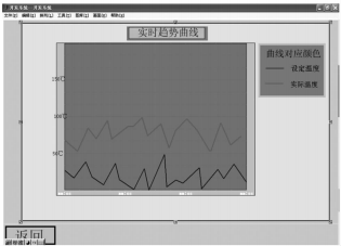 趨勢(shì)曲線可由操作者雙擊得到。實(shí)時(shí)曲線可按時(shí)間順序顯示,快速反映系統(tǒng)變量,對(duì)于過去的系統(tǒng)變量不能正確查詢,時(shí)間設(shè)置可通過"表示定義設(shè)置"來設(shè)定。本文組態(tài)畫面中,常用的是藍(lán)色曲線和紅色曲線。藍(lán)色曲線表示系統(tǒng)設(shè)定的參考溫度,紅色曲線則表示真實(shí)的實(shí)際溫度。在系統(tǒng)溫度控制過程中,X方向表示時(shí)間軸,y方向表示變量百分比。在y軸上通常不會(huì)出現(xiàn)實(shí)際溫度值,但可以通過相關(guān)工具箱的文本標(biāo)志記憶。本系統(tǒng)中的溫度量程是200℃,故X方向的0.50處表示100℃。用戶可在查詢完數(shù)據(jù)后返回,能夠快速轉(zhuǎn)換到系統(tǒng)主界面中,如圖4所示。