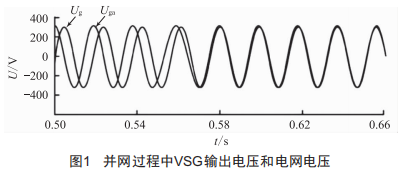 圖1為采用本文控制策略的并網(wǎng)仿真過(guò)程中,VSG輸出的電壓和大電網(wǎng)的電壓波形。0~0.50s孤島運(yùn)行,在0.50s接收到并網(wǎng)信號(hào),0.66s時(shí)完成并網(wǎng)過(guò)程,VSG和電網(wǎng)電壓達(dá)到一致,跟蹤效果好,響應(yīng)速度快。