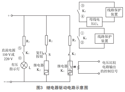 繼電器驅(qū)動(dòng)電路通過電壓比較電路的電源模塊取得供電電源,并受電壓比較電路的控制。電壓比較電路通過數(shù)據(jù)輸出模塊輸出數(shù)據(jù),并輸入到繼電器驅(qū)動(dòng)電路中,驅(qū)動(dòng)繼電器工作。驅(qū)動(dòng)器工作示意圖如圖3所示。當(dāng)線路有壓時(shí),電壓比較電路輸出有壓控制信號(hào),繼電器K1動(dòng)作,K1開關(guān)閉合,有壓指示燈亮,顯示線路有壓,同時(shí)線路保護(hù)裝置檢測(cè)到線路有壓信號(hào):當(dāng)線路無壓時(shí),電壓比較電路無控制信號(hào)輸出,K1開關(guān)斷開,有壓指示燈滅,顯示線路無壓,同時(shí)線路保護(hù)裝置檢測(cè)到線路無壓信號(hào)。圖中,R1、R2、R3為控制回路的相關(guān)保護(hù)元件(電阻、電感、電容),K2為復(fù)歸繼電器,s為復(fù)歸按鈕。