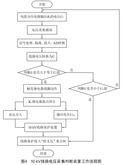 10kV線路電壓采集判斷裝置通過電阻分壓電路對(duì)線路電壓進(jìn)行分壓,并從分壓電阻Rb采集10kV線路電壓信號(hào)U1。由于U1功率小,不足以驅(qū)動(dòng)繼電器電路,并且不能直接進(jìn)行信號(hào)的A/D轉(zhuǎn)換,因此采樣的電壓信號(hào)還需輸入到電壓比較模塊。電壓比較模塊對(duì)采集信號(hào)進(jìn)行濾波、隔離、放大及A/D轉(zhuǎn)換后輸入到微機(jī)處理器,微處理器對(duì)采樣的線路電壓信號(hào)進(jìn)行邏輯判斷,當(dāng)采集電壓超過微機(jī)處理模塊整定的有壓值Uy(Uy取70%UN)時(shí),將通過數(shù)據(jù)輸出模塊輸出信號(hào)控制繼電器K1開關(guān)動(dòng)作。此時(shí)繼電器K1常開的3對(duì)接點(diǎn)①/②、③/④、⑤/⑥均閉合,其中①/②接點(diǎn)閉合引至10kV線路保護(hù)的保護(hù)開入模塊,作為"線路有壓"的開入功能:③/④接點(diǎn)閉合串聯(lián)10kV母線二次電壓UA,輸入到10kV線路保護(hù)裝置的采樣模塊UxL,作為線路的采集電壓:⑤/⑥接點(diǎn)閉合時(shí),線路有壓帶電指示燈點(diǎn)亮,完成線路有壓檢測(cè)。因此,當(dāng)線路處于正常運(yùn)行狀態(tài)時(shí),線路電壓采集判斷裝置一直處于有壓工作狀態(tài),有壓指示燈常亮,保護(hù)裝置一直檢測(cè)線路有壓。當(dāng)采集的線路電壓低于微機(jī)處理模塊整定的有壓值Uw(Uw取30%UN)時(shí),數(shù)據(jù)輸出模塊將無控制信號(hào)輸出,繼電器K1開關(guān)不動(dòng)作,繼電器K1的3對(duì)常開接點(diǎn)斷開,保護(hù)裝置將檢測(cè)到10kV線路無壓,此時(shí)若重合閘裝置投入工作,保護(hù)裝置將進(jìn)行檢無壓重合閘,其工作流程圖如圖4所示。