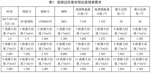 通過過熱度和恒拉速管理的系統(tǒng)需求(表1),確定數(shù)據(jù)采集點(diǎn)和數(shù)據(jù)采集方式。(1)兩座連鑄機(jī)、兩座精煉爐、工藝監(jiān)督屋內(nèi)電腦需具備。(2)開發(fā)一個程序。(3)異常不合理的溫度和拉速數(shù)據(jù)系統(tǒng)需要剔除,自動識別。(4)實(shí)現(xiàn)鋼種和過熱度對應(yīng)關(guān)系的增、刪、查、改功能。(5)實(shí)現(xiàn)導(dǎo)出至Exce1的功能。