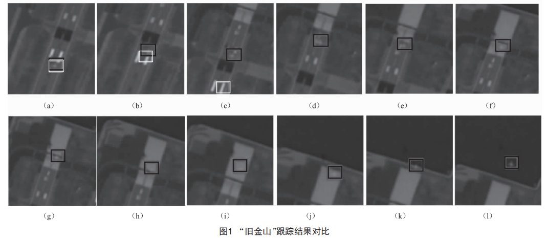 圖1對(duì)比了本文算法和STC算法"舊金山"視頻序列中飛行器進(jìn)行目標(biāo)跟蹤實(shí)驗(yàn)結(jié)果,其中白色細(xì)框?yàn)镾TC算法跟蹤結(jié)果,黑色粗框?yàn)楸疚乃惴ǜ櫧Y(jié)果。可以看出,測(cè)試視頻序列中背景與目標(biāo)的圖像特性相似度極高,人眼已難以從背景中提取出目標(biāo),跟蹤難度極大。在目標(biāo)經(jīng)過(guò)跑道背景中的白塊時(shí),由于背景信息對(duì)目標(biāo)造成的極大干擾,STC算法在尋找目標(biāo)時(shí)出現(xiàn)錯(cuò)誤,真實(shí)目標(biāo)的響應(yīng)峰值并不是其最大值,進(jìn)而導(dǎo)致跟蹤失敗。