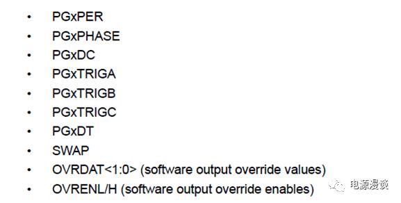 所謂PWM模塊的BUFFER寄存器,就是PWM模塊在以當(dāng)前寄存器值運(yùn)行時(shí),允許其SFR特殊功能寄存器值進(jìn)行改寫,這些值先緩存在寄存器中,在后續(xù)的某一個(gè)時(shí)刻會(huì)應(yīng)用在PWM模塊的輸出中。在芯片中允許進(jìn)行BUFFER的寄存器及寄存器位如圖1所示。