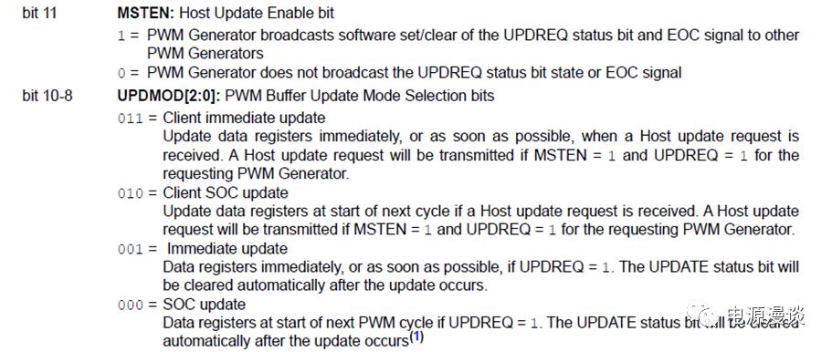 dsPIC33CH/dsPIC33CK中允許不同的PWM產(chǎn)生同步更新數(shù)據(jù)BUFFER寄存器,具體而言,采用對(duì)MSTEN bit進(jìn)行設(shè)置,MSTEN設(shè)置為1,則允許當(dāng)前PWM產(chǎn)生器對(duì)其它PWM產(chǎn)生器進(jìn)行廣播更新要求及SOC信號(hào),其UPDREQ和UPDATE bit可以廣播給其它的PWM產(chǎn)生器。