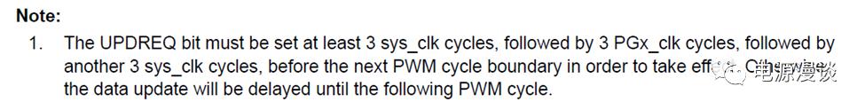 在圖8所示的更新模式中,一個(gè)值得注意的地方,我們放在圖9所示,針對(duì)SOC更新,UPDREQ的置位時(shí)刻需要和下一個(gè)PWM周期的邊界保持一定的時(shí)間間隔,這樣才能使得更新生效,否則數(shù)據(jù)更新將會(huì)被delay到接下來的一個(gè)PWM周期中。