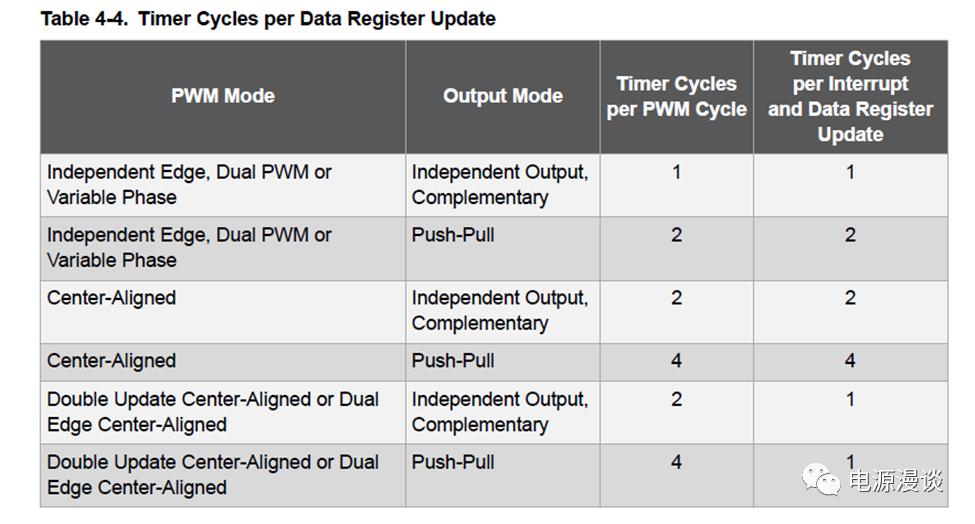 由于PWM的運(yùn)行模式及I/O輸出模式會(huì)導(dǎo)致每一個(gè)PWM周期由不同個(gè)數(shù)的PWM定時(shí)器周期組成,那么在數(shù)據(jù)更新上也會(huì)有一定的區(qū)別,如圖10所示,給出了不同PWM模式下的對(duì)應(yīng)的PWM定時(shí)器周期個(gè)數(shù),及定時(shí)器周期中斷和數(shù)據(jù)寄存器更新的個(gè)數(shù)。