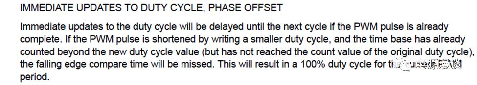對(duì)占空比的立即更新,有兩種情況需要說明。一種情況是,更新命令發(fā)生時(shí),PWM脈沖寬度已經(jīng)結(jié)束,那么這個(gè)立即更新會(huì)延時(shí)到下一個(gè)周期生效。