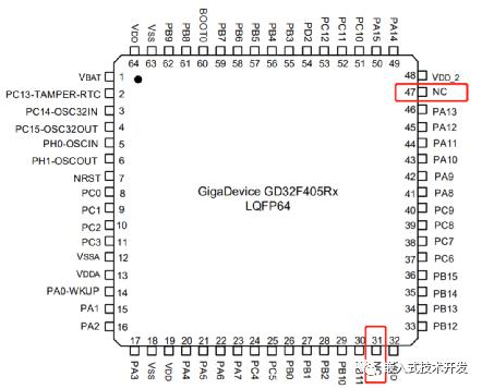 1.硬件我用的單片機型號為GD32F405RGT6,對應(yīng)STM32F405RGT6。首先,硬件上基本兼容,有一點不同的是GD32的31和47腳為NC,STM32的為VCAP。STM32這兩個引腳需要分別連接一個電容到GND,而GD32則不需要。當(dāng)然,有這兩個電容也無所謂,所以,硬件上GD32可以直接替換STM32。