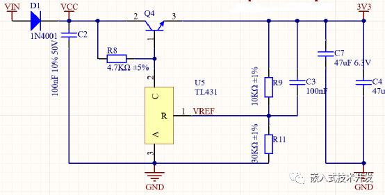 1.硬件設(shè)計(jì)1.1電源電源采用一個TL431+一個三極管構(gòu)成線性穩(wěn)壓電路。采用這種方式,一方面是因?yàn)槌杀据^低,另一方面,可以做大較大的電源輸入范圍(普通的1117-3.3等芯片輸入范圍也就到16V)。另外,TL431還可以為ADC提供參考電壓。