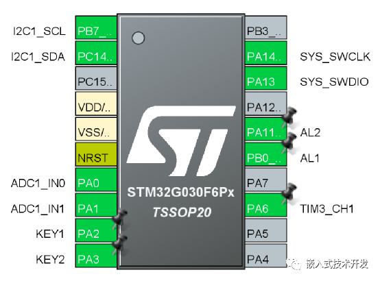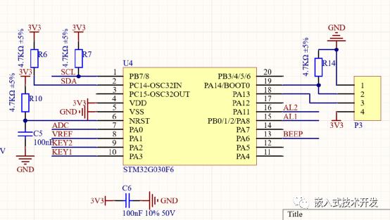 1.3單片機(jī)及AD采樣單片機(jī)使用STM32G030F6,內(nèi)置ADC支持硬件過采樣,可以達(dá)到16位分辨率。采集電流或電壓,通過選擇合適的電阻即可。采集4-20mA電流時,R12為0R,R4為150R。采樣電壓時,R12和R4選擇合適的電阻分壓,使輸入范圍在3.3V以內(nèi)。如果是直接采集電源電壓,短接R13即可。另外一路ADC通道采集TL431的VREF引腳,作為參考電壓。