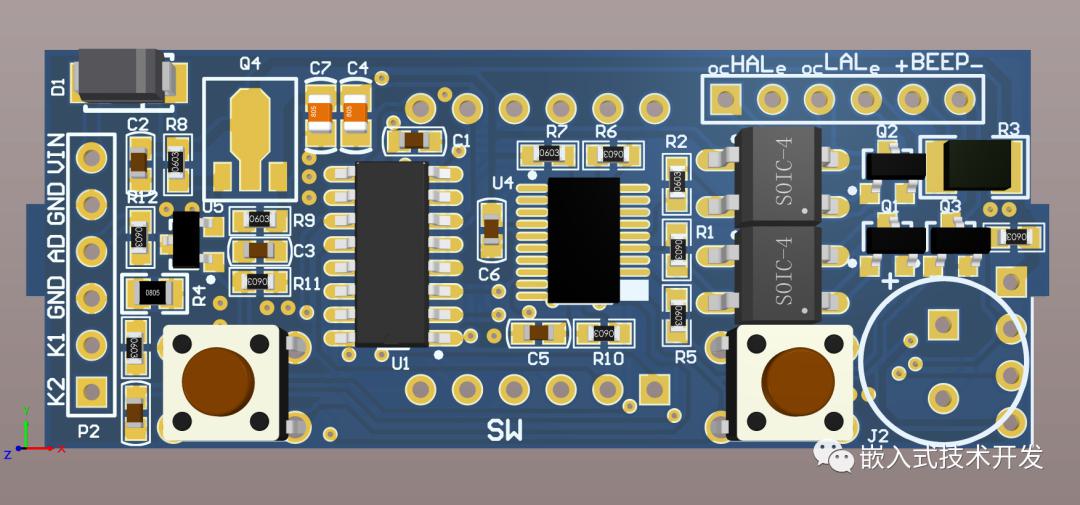 1.5按鍵兩個按鍵用于設(shè)置顯示參數(shù)、報警參數(shù)、校準(zhǔn)等。兩個按鍵同時引出到端子上,也可外接按鍵。同時2個按鍵使用的是串口功能的引腳,可修改程序?qū)崿F(xiàn)串口輸出及設(shè)置。最終的PCB板如下,背面為數(shù)碼管。