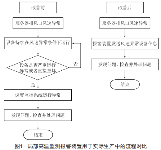 圖1為新增服務(wù)器排風(fēng)口風(fēng)速監(jiān)測報警裝置與常規(guī)機房中無排風(fēng)量監(jiān)測裝置的異常和故障處理流程對比圖。