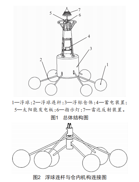 自發(fā)電式海上燈浮標(biāo)的整體結(jié)構(gòu)如下:該裝置由浮球、浮球連桿、浮標(biāo)倉體、蓄電裝置、太陽能發(fā)電板、指示燈以及雷達(dá)反射裝置組成。如圖1所示,每隔60°設(shè)置一個(gè)浮球,共設(shè)置六個(gè)浮球,兩兩一組在同一條直線上。浮球通過連桿與浮標(biāo)倉體內(nèi)的空間固定圓柱相連,浮球連桿與浮標(biāo)倉體接觸處設(shè)置槽口,浮標(biāo)倉體下底有微小的錐度,中心留有一小孔,如大浪將水帶入浮標(biāo)倉體內(nèi)部可以短時(shí)間將水排出。浮標(biāo)倉體上方固定著上體支架,蓄電裝置放置在支架體中下方位置,通過兩條橫向支撐板固定,支架上方設(shè)置太陽能發(fā)電板、指示燈以及雷達(dá)反射裝置。浮標(biāo)倉體底部通過錨固定的方式控制浮標(biāo)所能移動的范圍。