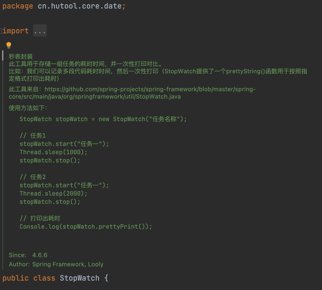 查看 hutool 工具庫中的 StopWatch 源碼可以得出,該類其實(shí)就來自 Spring 的 StopWatch.java,用法也完全一致。