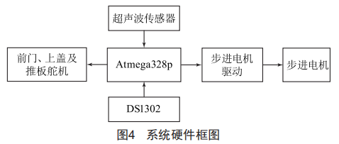 垃圾桶蓋需要在有人接近時(shí)自動(dòng)開啟,垃圾桶前門和推板機(jī)構(gòu)則需要在傾倒垃圾時(shí)啟動(dòng)。這幾個(gè)部分均設(shè)計(jì)為直接通過舵機(jī)驅(qū)動(dòng),上蓋、前門、推板分別與舵機(jī)軸通過固定銷作剛性連接,且與垃圾桶筒體間通過固定較鏈形成轉(zhuǎn)動(dòng)副。