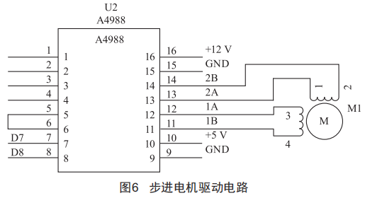 本文采用A4988步進(jìn)電機(jī)驅(qū)動(dòng)芯片,該芯片驅(qū)動(dòng)42步進(jìn)電機(jī)時(shí)只占兩個(gè)I/O口,控制方便,其中6腳為脈沖數(shù)控制引腳,控制電機(jī)轉(zhuǎn)動(dòng)的角度,8腳為步進(jìn)電機(jī)正反轉(zhuǎn)控制引腳。