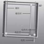 本垃圾桶需要在開門傾倒垃圾前將垃圾封裝打包,打包機(jī)構(gòu)設(shè)計(jì)采用螺旋傳動(dòng),通過螺桿轉(zhuǎn)動(dòng)帶動(dòng)螺母桿作直線移動(dòng)。如圖3所示,打包機(jī)構(gòu)右方槽中安裝有電熱絲,兩連接桿前端綁有熱膠帶,起輔助加熱作用。打包時(shí),圖中下方電機(jī)轉(zhuǎn)動(dòng),帶動(dòng)螺桿轉(zhuǎn)動(dòng)從而驅(qū)動(dòng)螺母桿將垃圾袋擠壓到下方位置:而后圖中右方電機(jī)轉(zhuǎn)動(dòng),通過螺旋傳動(dòng)將垃圾袋拘束到右側(cè)的狹小區(qū)域,電熱絲通電同時(shí)熱量傳遞到桿上熱膠帶,將垃圾袋局部熔融形成結(jié)節(jié),垃圾袋打包完成。