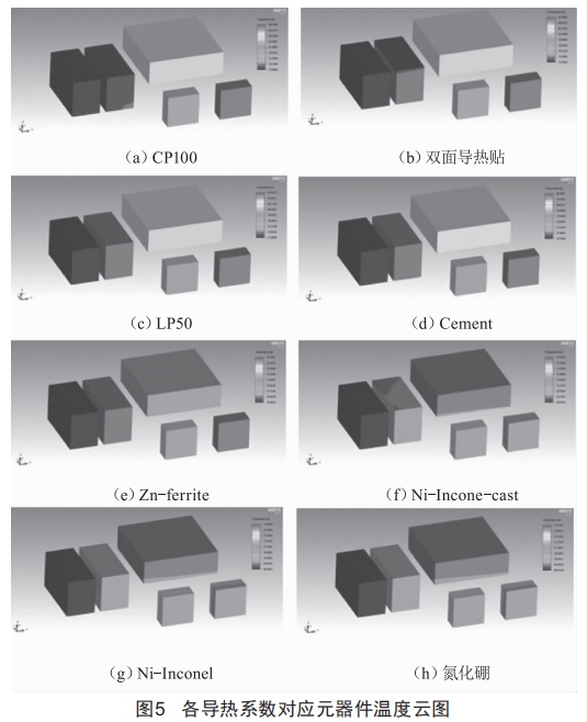 在環(huán)境溫度55℃,自然對(duì)流冷卻條件下,選取不同導(dǎo)熱材料,計(jì)算ECU元器件溫度云圖,各導(dǎo)熱材料對(duì)應(yīng)溫度云圖如圖5所示。