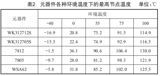 發(fā)動(dòng)機(jī)ECU工作的環(huán)境溫度為-40~100℃。溫度變化幅度達(dá)140℃,范圍極大。主要計(jì)算環(huán)境溫度為-40℃、0℃、55℃、75℃和100℃時(shí)各主要發(fā)熱元器件最高節(jié)點(diǎn)溫度。ECU各主要發(fā)熱元器件溫度分布如圖3所示。
