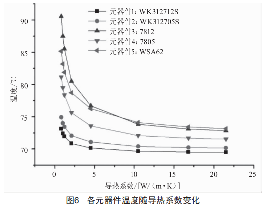 將導(dǎo)熱系數(shù)與各發(fā)熱元器件最高節(jié)點(diǎn)溫度擬合成二維曲線,如圖6所示。