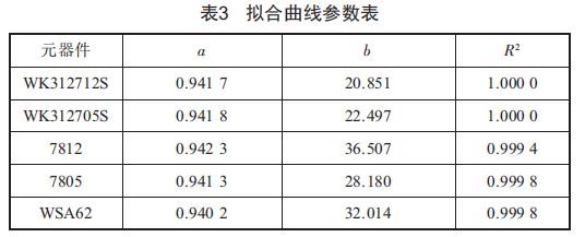 以元器件7812為例,從表3中數(shù)據(jù)可以看出,計(jì)算得出的a值為0.9423,b值為36.507,擬合精度判斷系數(shù)R2為0.9994,擬合精度高,結(jié)果準(zhǔn)確。對(duì)于元器件7812,則式(4)具體表達(dá)式如下: