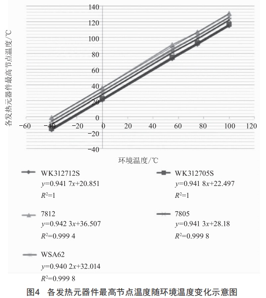 由圖4可見(jiàn),環(huán)境溫度在-40~100C范圍內(nèi)變化時(shí),發(fā)動(dòng)機(jī)ECU各發(fā)熱元器件最高節(jié)點(diǎn)溫度基本上呈線性變化規(guī)律,當(dāng)其他條件不變時(shí),ECU最高節(jié)點(diǎn)溫度與環(huán)境溫度滿(mǎn)足如下關(guān)系式: