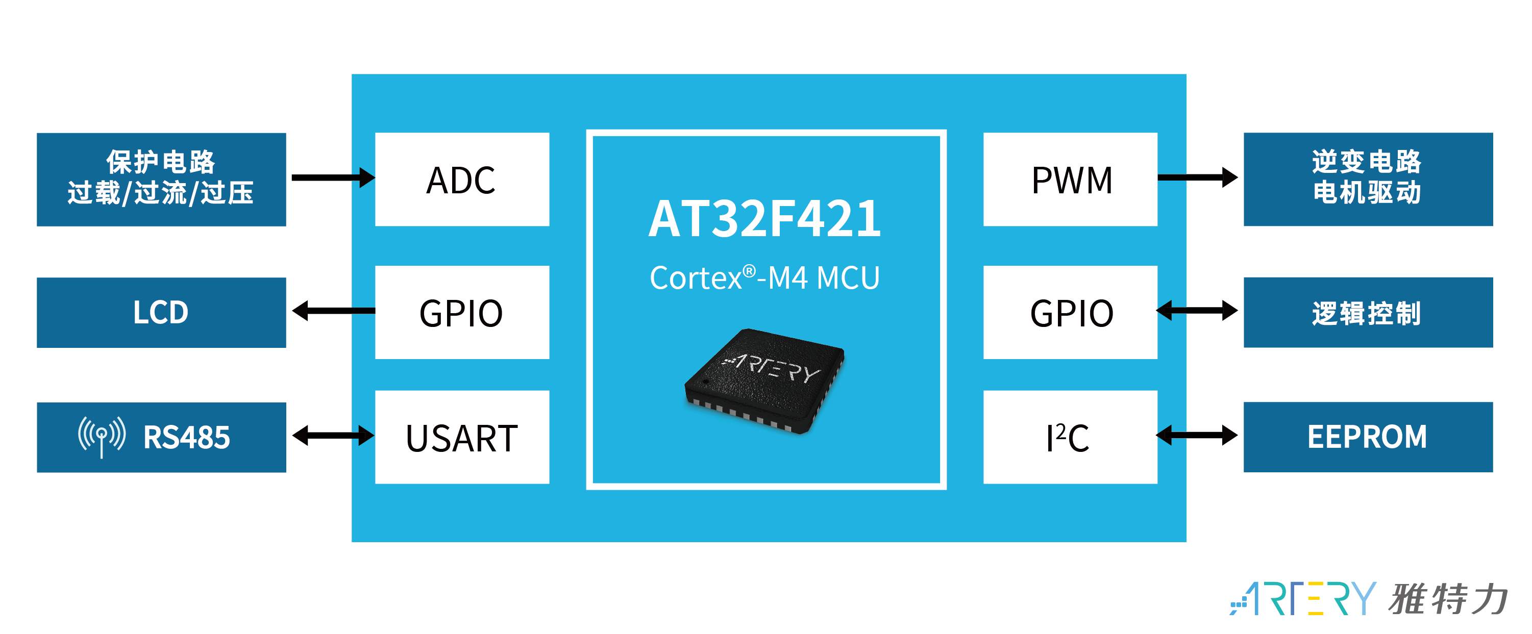 矢量變頻控制的扭矩大、扭矩輸出平穩(wěn),噪音小、效率高。但是控制算法復雜、運算量較大,對MCU性能有一定要求。雅特力矢量變頻器應用方案采用AT32F421系列超值型ARM® Cortex®-M4微控制器,M4內(nèi)核可媲美M0價格,主頻高達120MHz,最高可支持64KB閃存存儲器(Flash)及16KB隨機存取存儲器(SRAM),提供豐富接口與各種功能,可實現(xiàn)高性能、高精度的電機驅(qū)動控制。