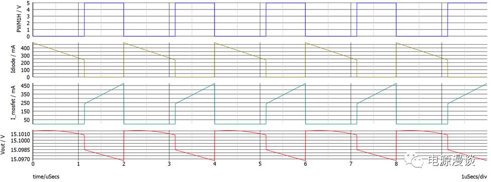 從圖13所示的相關(guān)變量測量值來看,占空比實際為43%,由于是非同步整流,比理想占空比偏大,而在155mV的電壓環(huán)給定下,輸出電壓為我們期望的15V設(shè)定值。