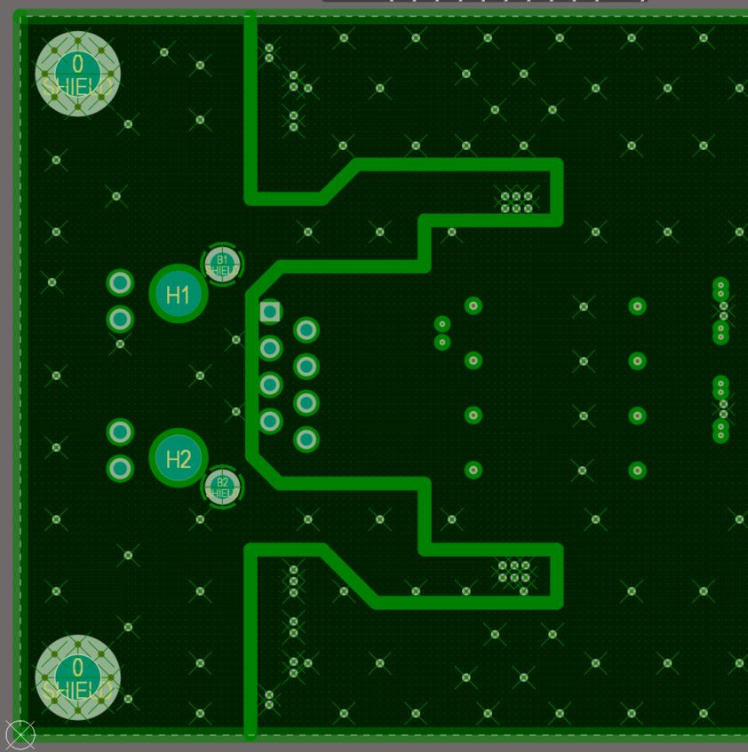 圖 3 展示的是以太網(wǎng)接口區(qū)域四層PCB板布線。金屬殼接地與四層中所有PHY側(cè)GND 隔離,因此金屬殼的接地平面不會與其它層的GND平面重疊,盡可能減小電容耦合。地平面以 4 毫米網(wǎng)格的過孔連接。網(wǎng)口差分信號參考地平面,阻抗 100 Ω ,差分線的寬度 0.154mm,間距 0.125mm。RJ45連接器位于 PCB 的邊緣,確保與金屬外殼的低阻抗連接。