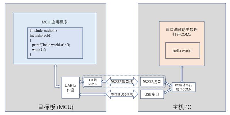 首先簡(jiǎn)介下本文介紹的打印輸出方法整體軟硬件框圖,硬件上主要是 PC 主機(jī)、MCU 目標(biāo)板、一根連接線(連接線有兩種方案:一種是 RS232 串口線、另一種是 TTL 串口轉(zhuǎn) USB 模塊板)。