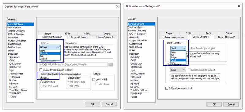 然后注意工程選項(xiàng)里跟 Library 實(shí)現(xiàn)相關(guān)的如下三處設(shè)置。其中 Library 選項(xiàng)配置的是 runtime lib 的功能,有 Normal 和 Full 兩個(gè)選項(xiàng)(可按需選擇);Printf formatter 選項(xiàng)決定格式化輸出功能細(xì)節(jié),分 Full、Large、Small、Tiny 四個(gè)選項(xiàng)(可按需選擇)。Library low-level interface implementation 選項(xiàng)決定低層 I/O 實(shí)現(xiàn),這里我們選 None,即由用戶來(lái)實(shí)現(xiàn)。