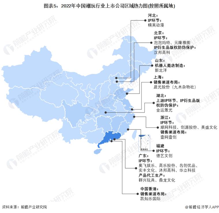 目前中國潮流玩具注冊企業(yè)主要分布在華北和華東,其中廣東是潮流玩具企業(yè)主要注冊的熱土。截止2022年7月,潮玩行業(yè)內(nèi)的上市企業(yè)主要集中于東南沿海全區(qū)域,其中廣東省上市企業(yè)最多。