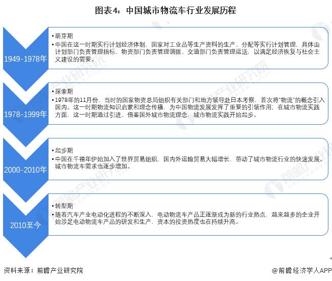 我國(guó)在汽車(chē)制造和物流理念上起步較晚。從1978年物流概念引入我國(guó)以來(lái),到2000年我國(guó)加入了世界貿(mào)易組織,國(guó)內(nèi)外對(duì)物流需求大幅增加,再到現(xiàn)如今新能源物流車(chē)的興起,總共經(jīng)歷了如下四個(gè)階段: