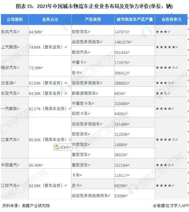 目前,布局了城市物流車(chē)生產(chǎn)業(yè)務(wù)的上市企業(yè)中,上汽集團(tuán)的城市物流車(chē)產(chǎn)品產(chǎn)量遙遙領(lǐng)先于其它企業(yè)。城市物流車(chē)產(chǎn)業(yè)鏈上的其它代表性企業(yè)業(yè)務(wù)布局及競(jìng)爭(zhēng)力情況如下: