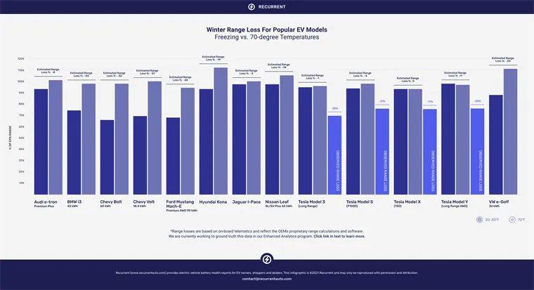 今年3月,國(guó)外一家叫做Recurrent聲稱他們?cè)诙径緱l件下對(duì)13款電動(dòng)汽車進(jìn)行了測(cè)試。結(jié)果顯示,特斯拉Model X 75D是唯一一個(gè)在低溫下沒(méi)有損失續(xù)航范圍的車輛。其他類型車輛均出現(xiàn)不同程度的里程衰減,其中,雪佛蘭Bolt和雪佛蘭Volt表現(xiàn)最差,分別損失了32% 和31%的續(xù)航里程。
