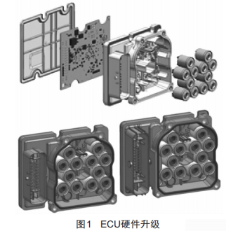 (1)電子液壓控制單元(EHCU)硬件升級:在原有EHCU基礎(chǔ)上,面向新能源汽車的特性與要求,對其進行設(shè)計與改進。ECU的MCU采用了英飛凌TC233最新芯片技術(shù),ECU設(shè)計升級了EPB的控制電路,同時采用了更大的內(nèi)存容量,可支持客戶端的內(nèi)存擴展和軟件刷寫功能。如圖1所示,新的ECU集成了EPB的控制電路,左側(cè)的控制器接口從38針升級為46針。