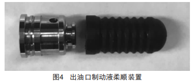 圖4為另一新增降低噪聲的組件一出油口制動液柔順裝置:采用獨特的可壓縮的EPDM橡膠套管,在內(nèi)部制動液壓力增大時,會壓縮橡膠套管,使制動液在排出模塊時始終保持平緩柔順的流速,給予駕駛員良好的駕車體驗。