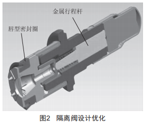 (2)隔離閥(1s0Valve)設(shè)計優(yōu)化:在隔離閥內(nèi)加入了帶有唇型密封圈的單向閥,使得隔離閥工作時的泄漏量由12mL/min下降至0.2mL/min,從而提升了閥的防泄漏功能。新的隔離閥使用3/64英寸超小直徑的行程桿,并適當增加了第一段氣隙,從而大幅降低了電磁閥工作時產(chǎn)生的噪聲,在控制器工作過程中給駕駛員帶來更舒適的體驗,如圖2所示。