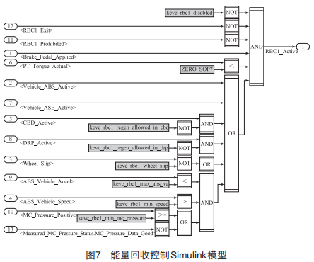 該技術(shù)最關(guān)鍵的是需要找到電機制動和機械制動的最佳覆蓋區(qū)間,在確保安全的前提下,盡可能多地回收能量,同時要保持制動踏板回饋感的一致性。RBC包含RBCl和RBC2,RBCl主要用于告知VCU車子即將進入主動安全模式,需要VCU及時退出能量回收:RBC2主要用于在高附路面踩制動踏板時,指揮VCU做能量回收。simulink模型如圖7所示。